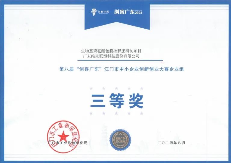 在2024年第八届“创客广东”江门市中小企业创新创业大赛上,广东维生联塑科技股份有限公司凭借其“生物基聚氨酯包膜控释肥研制项目”荣获三等奖。
